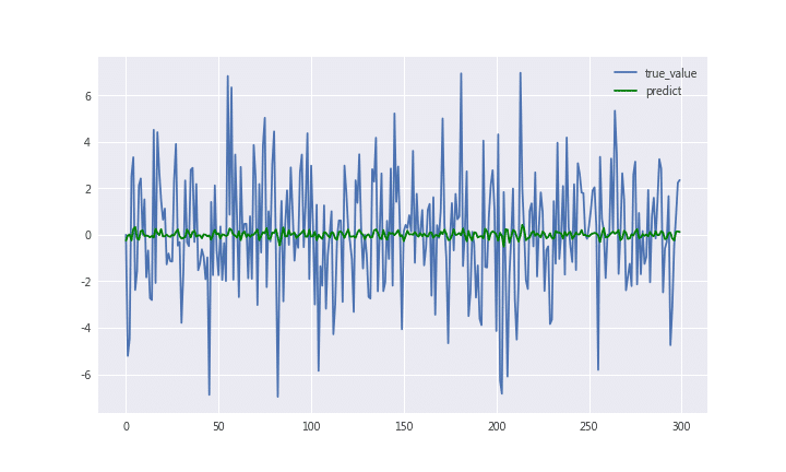 根據下圖,不難看出用回歸模型來預測報酬率實在有點難度,預測市場果然不那麼容易