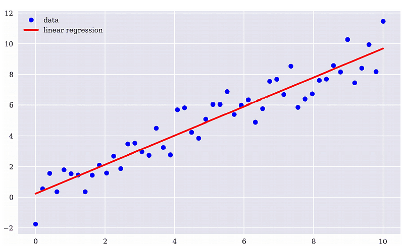 根據上面的回歸方程式我們可以在圖形上找到一條線,使得圖形上每個點到這條線的平均距離最小,也就是求使均方誤差(mean square error)最小的參數組合( β0, β1),下圖為理想中的情況。