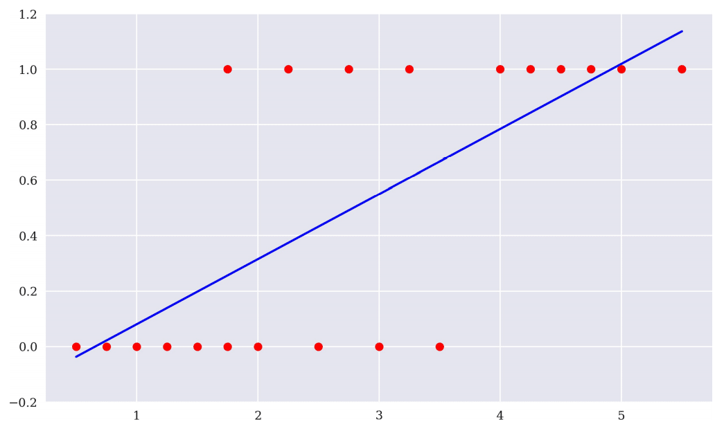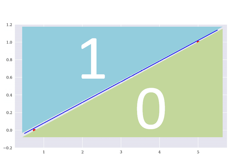 上述的線性回歸目的在找一條離所有資料點的平均距離最近的直線,那羅吉斯回歸就是在找一條可區分出最多資料的斜直線。理想情況如下,由下圖所示,該模型在類別1的部分只分錯兩筆資料,而在類別0僅分錯1筆。