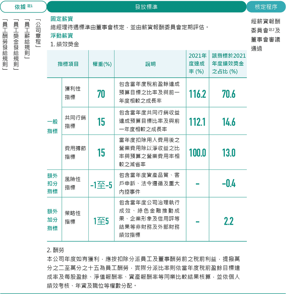 其他企業包含致力低碳轉型的台泥,台泥將公司治理、綠色金融、社會關懷、永續環境等非財務績效面向納入評估範圍,考量到的 ESG 指標包括職業安全、環保排污、節能減碳等永續指標績效。金融業則有多家皆採用此制度,在此列舉第一金為例,如下圖所示,第一金將公司治理、綠色金融、社會參與與永續環境等非財務指標作為加分項,評估結果交由薪酬委員會建議年度員工(含總經理)及董事酬勞發放數額之參據,影響權重 1~5%的獎金。