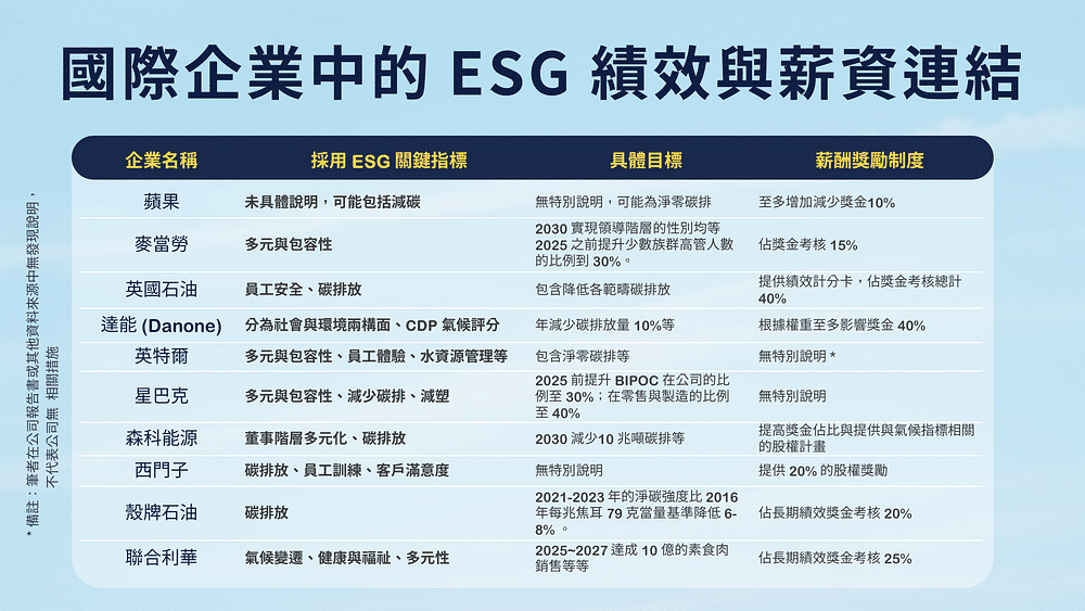 國際企業中的 ESG 績效與薪資連結案例。資料來源:Perillion、公司報告書、資行整理