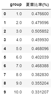 #形成表格 sharpe = pd.DataFrame(np.array(sharpe_list).reshape((10,2)), columns = ["group","夏普比率(%)"])