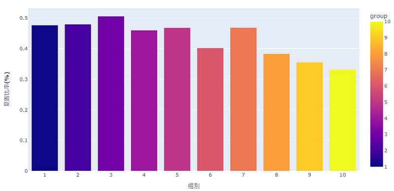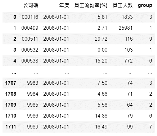 首先選取該年資料,並且刪除員工人數過低 (小於十分位數)樣本。接著使用 函數 pd.qcut(),依員工流動率由小到大形成十個組別,並呈現在group欄,最後儲存到 result 裡