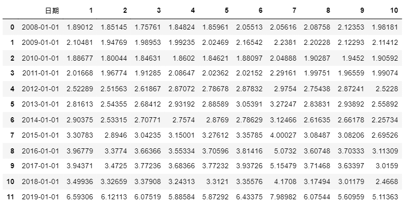 #表格 ret_table = ret_table.append(pd.DataFrame(data = np.array(port_ret).reshape((1,11)), columns = ['日期'] + [i for i in range(1,11)])).reset_index(drop=True)