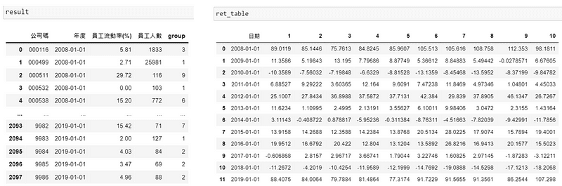 其他年份一樣重複以上步驟,透過迴圈不斷地去更新 result 與 ret_table ,最後得到以下結果。