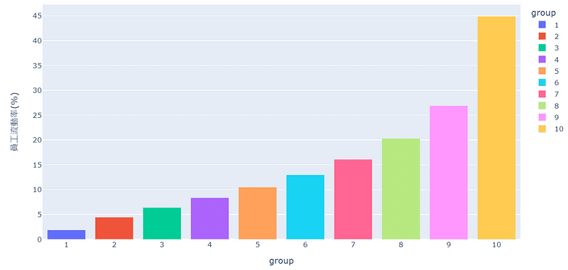 data['group'] = pd.qcut(data['員工流動率(%)'], q=10,labels = [i for i in range(1,11)])