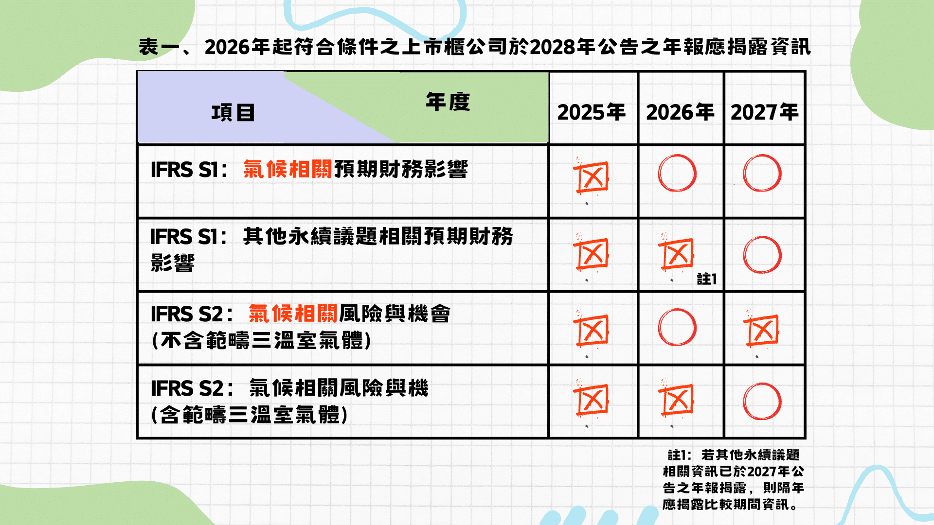 以台泥(1101)為例,它是一間資本額達775億元的上市公司。因此台泥將自2026年起適用IFRS永續揭露準則的兩號公報,並需於2027年3月15日前同時公告2026年財務報告及股東會年報。於該年年報的永續資訊專章至少應揭露資訊整理如下圖: