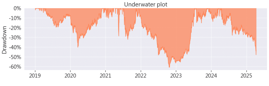從上圖數據中可以看出,這個策略的年化報酬率達到 28.26%,但同時伴隨著 37.251% 的高波動度,顯示出策略雖有潛力帶來高額收益,但風險同樣不小。因此,這個策略適合追求高回報且能承受較大波動的投資者,對於保守型投資者則可能不太合適。