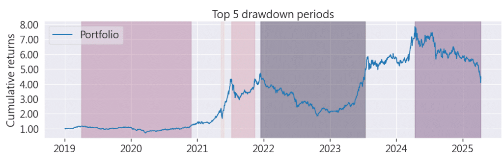 在這次策略中,獲得高額利潤的關鍵在於在承擔高風險的同時,成功持有了那些具備強勁上漲動能的股票。以 2021 年為例,策略受益於陽明海運的爆發性漲勢;在 2024 年,即便經歷了超過 10% 的跌幅,股票仍強勢回升,帶來可觀的獲利。但是在2025年關稅戰,他的表現甚至比大盤差許多,因此如果有興趣的讀者可以根據自己想驗證的情境自行調整代碼,設定止盈止損條件,策略的主要邏輯已經完善,靈活調整即可,這樣可以驗證不同設定對策略績效的影響。