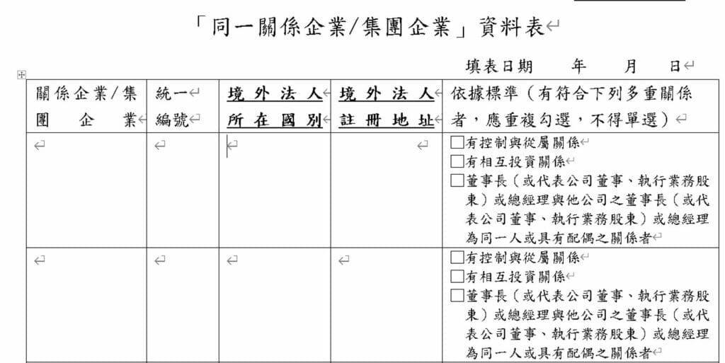 | 15 | 備註 | 若受控管名稱為法人時,為說明”受控管名稱”與”標的公司”因何種原因成為受控管名單。 若受控管名稱為自然人時,為說明與”姓名”為何種親屬關係。 |
