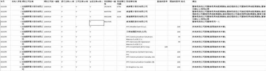 欄位包含:年月、持有人序號、標的公司名稱、標的公司統一編號、依據法規、受控管統一編號、受控管公司碼、受控管名稱、直接持股率、間接持股率、姓名及備註。