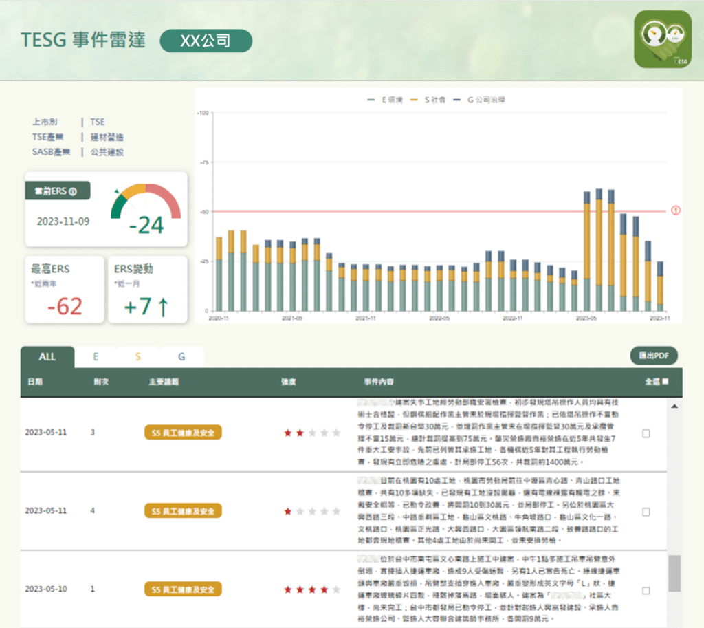 公司經常發生ESG負面事件,可透過 ERS事件雷達分數 (Event Radar Score) 來做日常監控。