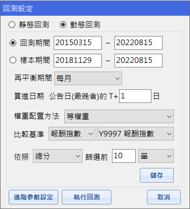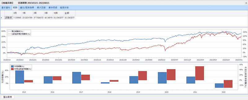 設定的關鍵在於檢驗一支策略在不同股市週期的環境下,是否還能夠維持穩健的報酬增長,也就是在多頭時期能顯著贏過大盤,空頭時期也要能挺過下跌逆勢成長。因此在期間設定上我們從2015年3月開始到2022年8月結束,期間經歷數次多頭、空頭和一大段的區間整理時期,藉此全面檢測一支策略在不同趨勢下的報酬穩健度。