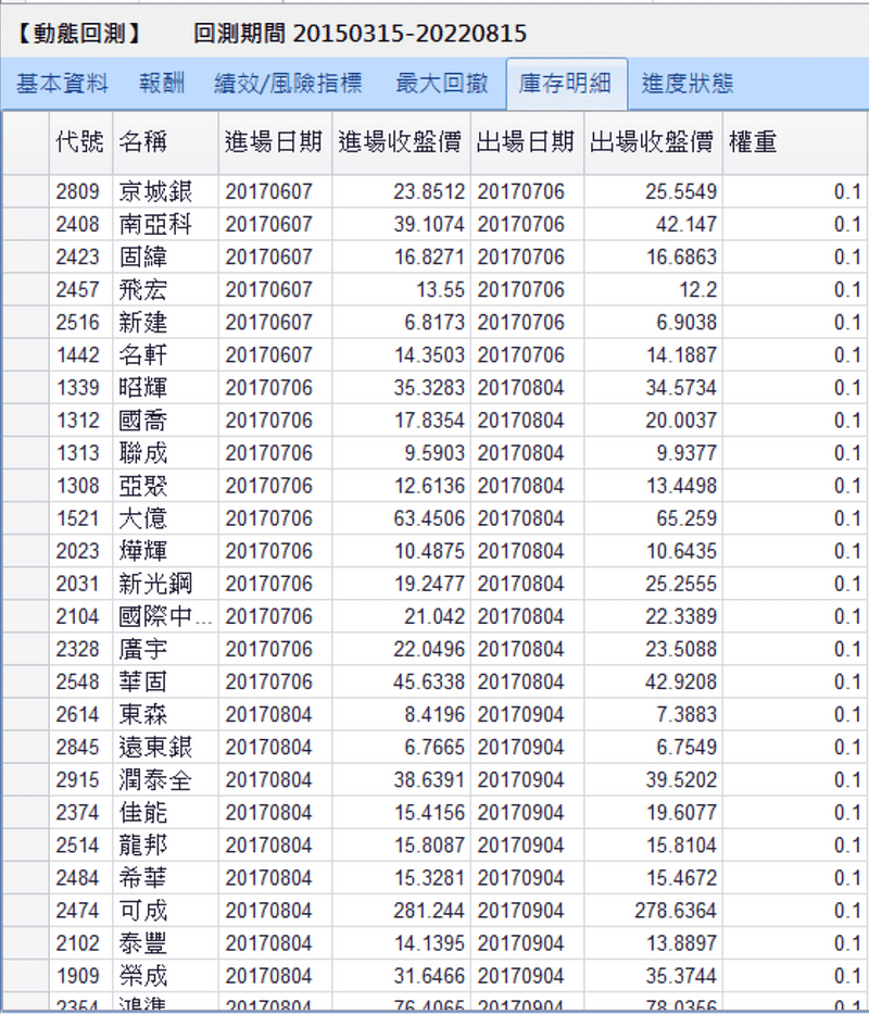 庫存明細提供使用者該策略下實際的股票進場時間以及相應的投組權重,使用者也能更清楚的看出是哪支股票貢獻了最多的報酬。