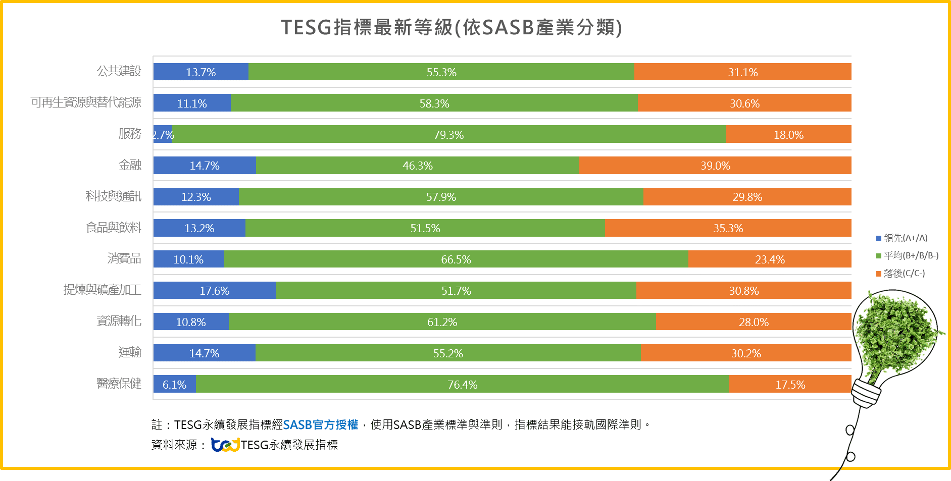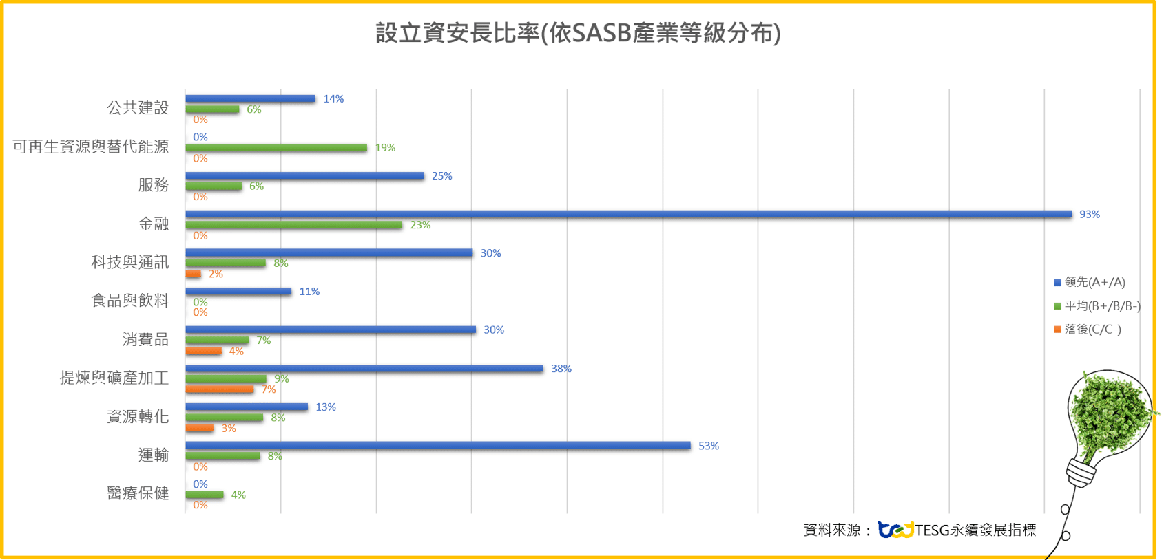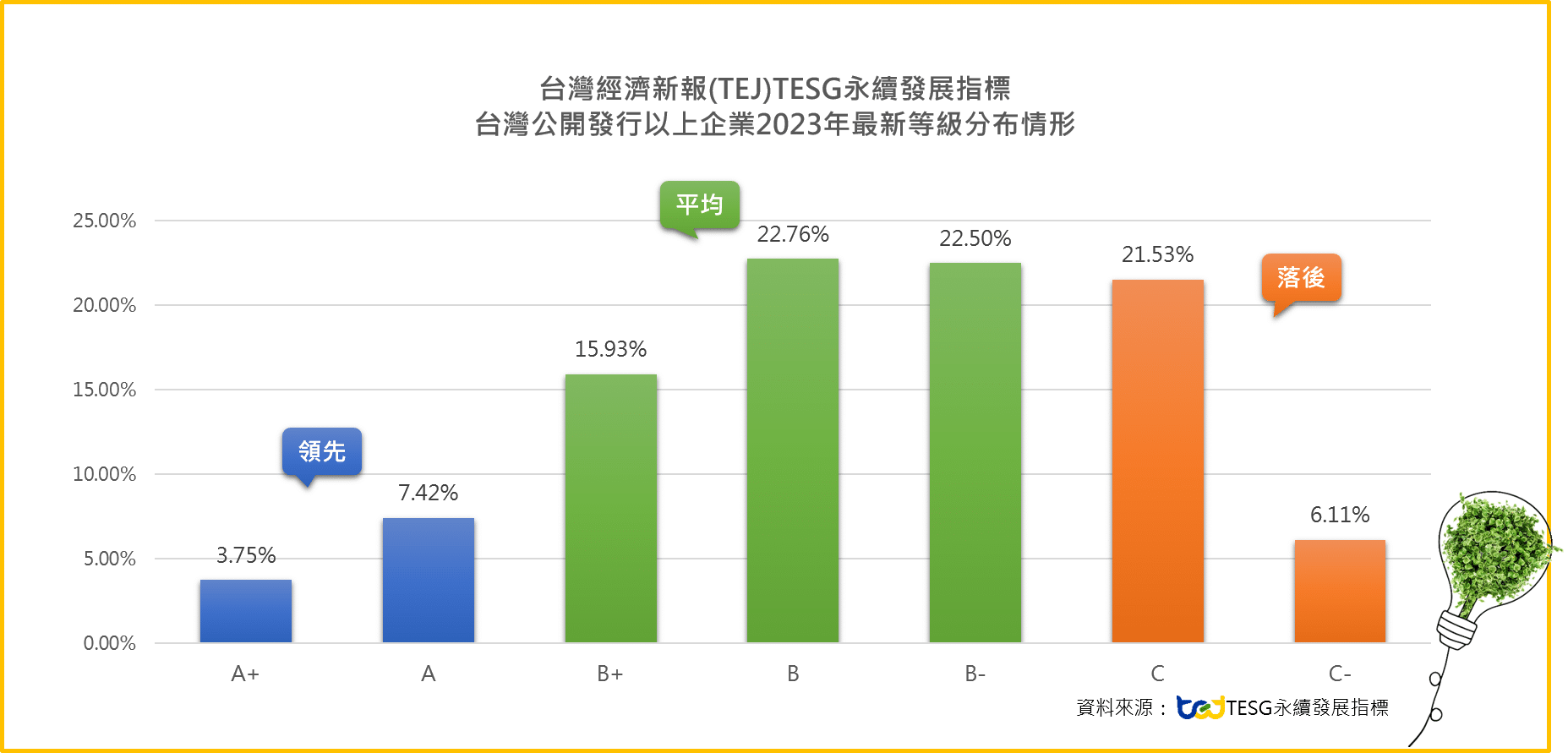 TESG對台灣上市櫃及公開發行所有企業評估ESG表現,等級從A+到C-共分為七等,三群組[領先/平均/落後],本次等級更新,領先的群組(A+和A等)佔整體受評公司有11.17%,指標分布情況,如下圖一: