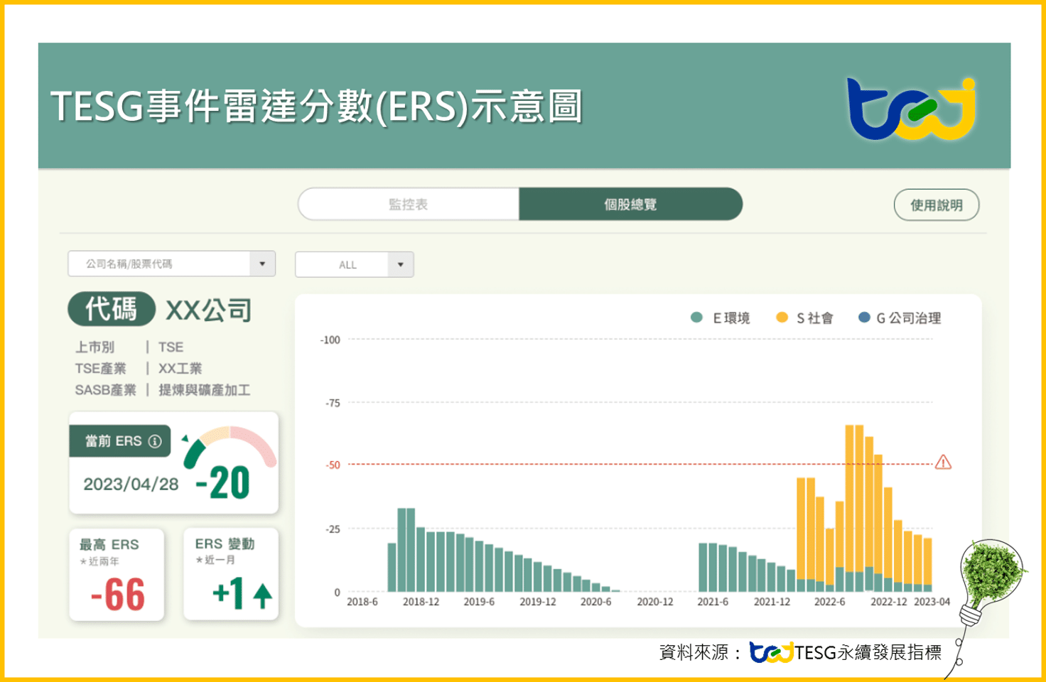 本次等級更新,新加入ESG事件雷達分數(ERS),將平日的ESG負面新聞發生次數、事件強度、時間…等綜合考量,整合為ERS分數,動態評估企業ESG事件。本次共有37家,因ERS綜合分數考量而降等,約佔1.6%。ERS分數除了在TESG等級中加入參考,也可以評估每日分數的升降,作為平日監測企業ESG表現的指標。