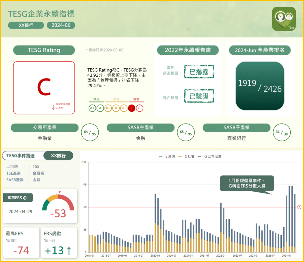以本次最新公布評等為例,所採用最新永續報告書資料為2022年。TEJ於評等及資料空窗期時發生重大ESG事件,即以ERS(事件雷達分數)轉換計分,反映在TESG等級上。如某金融機構之董事涉嫌挪用公款且遭裁處,因此TESG等級調降兩等;另外某其他電子產業類別企業之子公司,因連年虧損問題,遭會計師評斷2023Q4財報繼續經營能力存在重大不確定性,故TESG等級調降兩等。