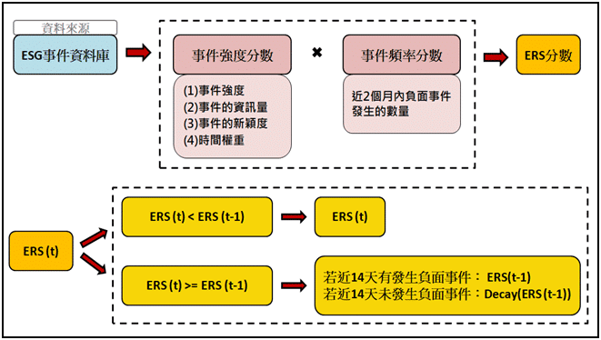 「事件雷達分數(ERS)」則是將原本非結構化的ESG事件及強度量化後,藉由ERS分數的變動,讓使用者可以從眾多公司中,快速找出需要監控及注意的公司,並透過原本「ESG事件資料庫」深入了解事件的詳細內容,以利加速使用者在進行責任投資或責任授信的決策流程。
